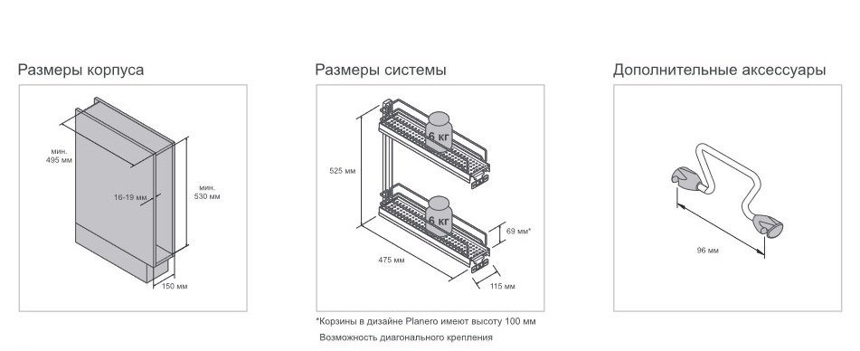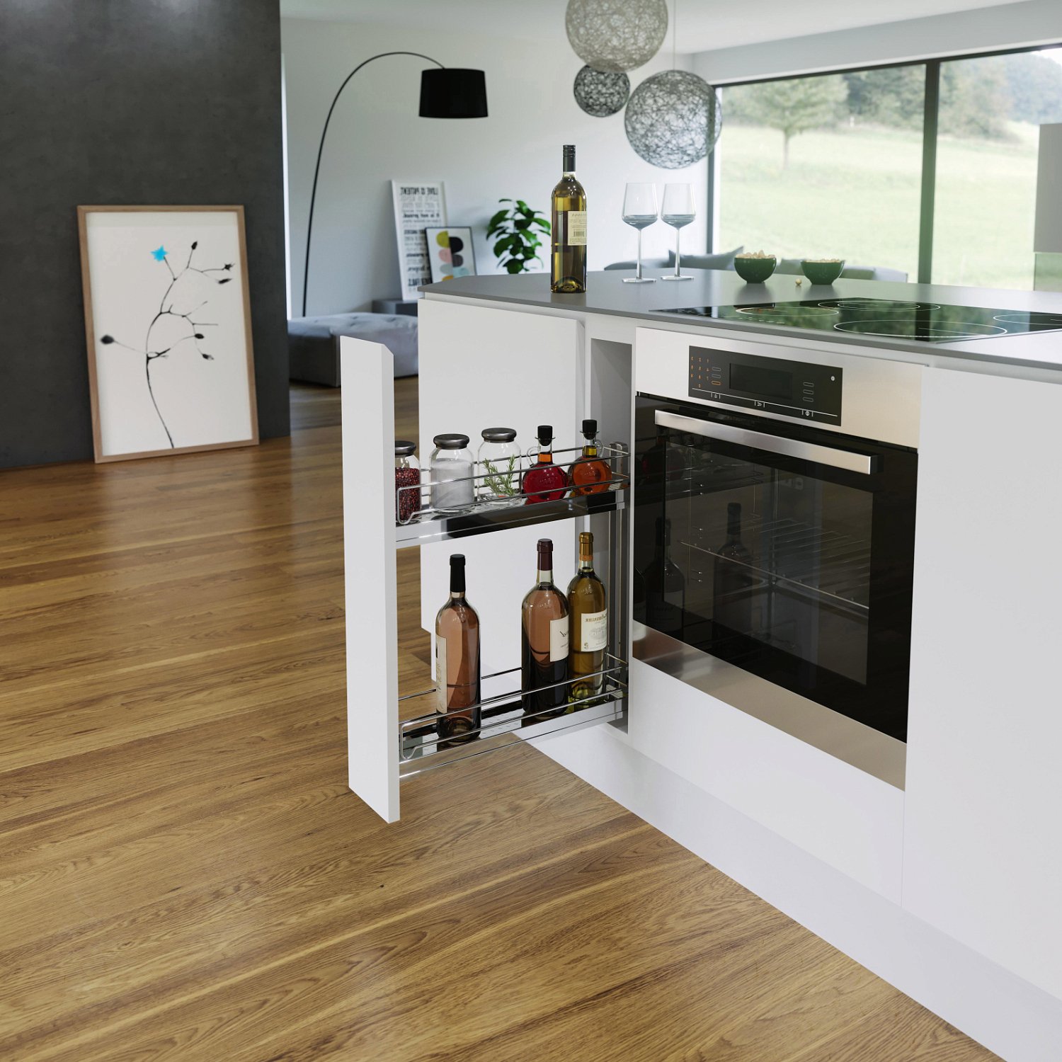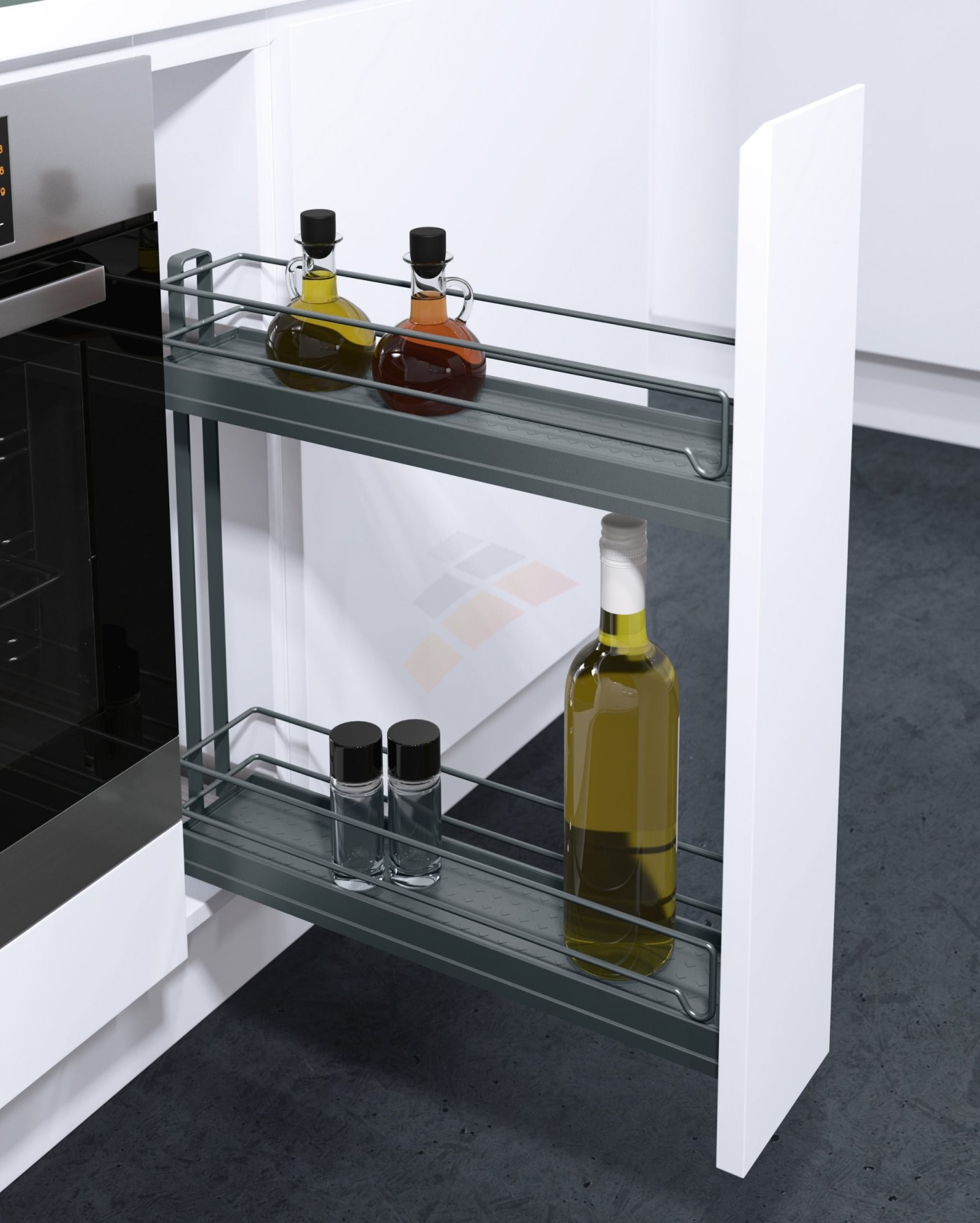 SUB Slim – бутылочница для нижней тумбы. Система крепится к фасаду и боковине корпуса. Корзины несъемные. Максимальная нагрузка на одну корзину – 6 кг.